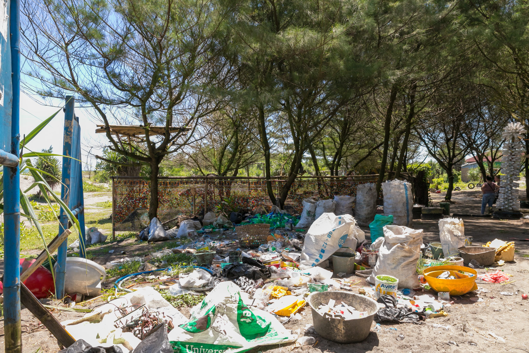 Bei der Müllbank Garduaction konnten wir solche Müllabgaberoutinen jedoch nicht beobachten, da die Anwohner*innen der umliegenden Dörfer keine aktiven Kund*innen sind. Die Müllbank-Organisatoren erklärten, dass ein Großteil der lokalen Bewohner*innen nicht über die Existenz der Müllbank informiert ist. Die Organisatoren bezogen das fehlende Wissen auf die finanziellen Strukturen der Müllbank: aufgrund der schwachen Finanzlage seien sie nicht in der Lage, die Müllbank bekannt zu machen und Aufklärungsarbeit zu leisten. Außerdem vermuten die Organisatoren, dass Haushalte ihren Abfall lieber an tukang rongsok (Müllsammler*innen, die den Abfall von Haushalten kaufen) verkaufen, da diese sofort bezahlen wohingegen Garduaction den monetären Wert des Mülls erst nach einem Zeitraum von drei Monaten auszahlt. Aufgrund der inaktiven Haushalte wendet Garduaction nicht das ursprüngliche Konzept der Müllbank an, sondern passt es den lokalen Gegebenheiten an. Anstatt mit Haushalten als Kund*innen zu arbeiten, kooperiert Garduaction mit Müllsammler*innen, die Abfall informell von Straßen, offenen Mülldeponien oder Stränden sammeln. Als wir unsere Feldforschung begannen, erwarteten wir eine übel riechende Müllbank. Doch wir bemerkten sofort, dass Garduaction ein besonderer Ort ist. Garduaction’s Eingang ist von Plastikinstallationen aus bemalten Flaschen gesäumt, die zu einem künstlerischen, offenen Areal führen. Sitzgelegenheiten aus alten Autoreifen, Bodenbelag aus Glasflaschen und eine bunte Bambushütte mit Plastikwänden – das Motto ist hier Upcycling.