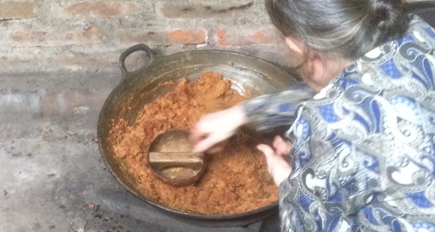 Im Distrikt Kokap, Yogyakarta wurde Kokosblütenzucker schon immer mit einer klaren Arbeitsteilung produziert. Jeden Morgen und Nachmittag klettern die Männer mit bloßen Händen und nichts als einem kleinen Messer oder einer Sichel auf Kokospalmen, um die Kokosblüten zu schneiden. Dann wird der tropfende Nektar in Bambusbehältern oder ‚bumbung‘ gesammelt. Die Frauen kochen den Nektar anschließend einige Stunden lang in einem mit Holzfeuer betriebenen Herd, bis die Flüssigkeit die richtige Konsistenz erreicht und auf Kopras oder getrockneten Kokosnussschalen geformt werden kann. Die einzigen Zusätze sind Kokosmilch oder geriebene Kokosnuss, um ein Überlaufen der kochenden Flüssigkeit zu verhindern, und eine Mischung aus Kalkwasser und Mangostan-Pflanzensaft, der eine gelbliche Kruste auf der Schale der Frucht bildet. Alle Zutaten sind in der Region von Natur aus reichlich vorhanden.