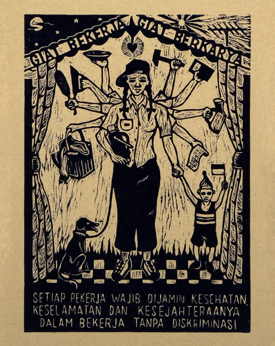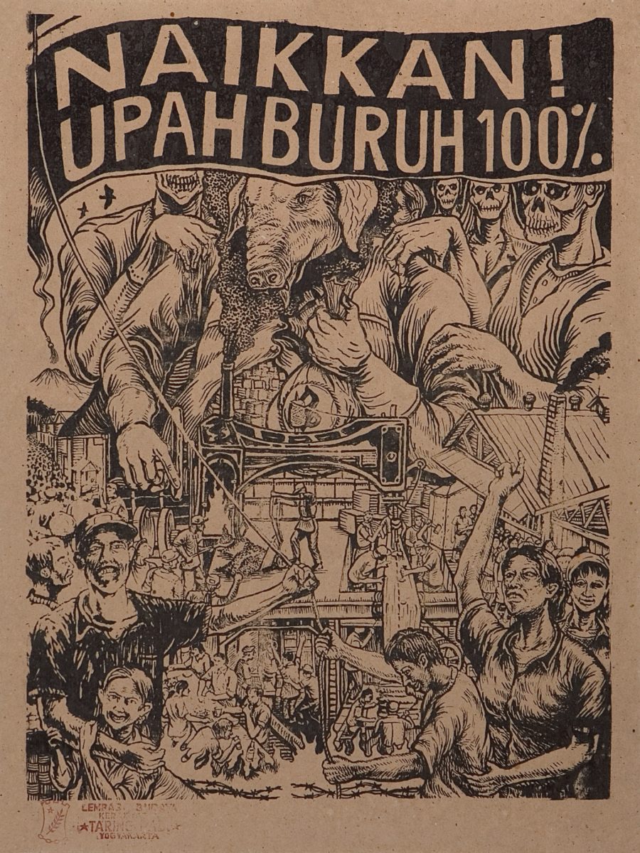 Die Bilder, die durch diesen Prozess entstehen, stammen definitiv aus einer Vielzahl von Quellen und sind mit linken Ideologien verbunden, die von dem von Natur aus strukturlosen Kollektiv angenommen werden. Sie setzen Karikatur und Humor ein und teilen diese visuelle Strategie mit vielen indonesischen Künstlern, darunter Apotik Komik, Heri Dono und Eddie Hara. Ihr direkter Gesamtansatz ist darauf ausgerichtet, eine politische Botschaft zu übermitteln. Ihre Holzschnitte, die auf billigem braunem Papier gedruckt und oft einfach an Wände geklebt oder über soziale Netzwerke verbreitet werden, weisen oft eine Bildsprache auf, die den sozialen Realismus von Käthe Kollwitz widerspiegelt. Ihre Wandbilder teilen die kompositorischen Strategien mexikanischer Wandmaler wie Diego Rivera – kurz gesagt: Ihre visuellen Einflüsse sind ebenfalls politisch. Das Kollektiv verfolgt zudem eine Strategie der Reduktion, in der Figuren als (Stereo-)“Typen“ (Bauer, Frau, Politiker, Prediger) dargestellt werden. Die Anthropomorphisierung von Schweinen und Hunden zu Ableitungsfiguren spiegelt die kulturellen und sprachlichen Einstellungen zu diesen Tieren auf Java und teils auch im globalen Sprachgebrauch wider (kapitalistische Schweine, Wachhunde usw.). In diesem gesellschaftlichen Kontext dürfte die Darstellung jüdischer Figuren mit Fangzähnen und blutroten Augen entstanden sein. Im mehrheitlich muslimischen Indonesien, wo pro-palästinensische Einstellungen normativ sind, würde angesichts solcher Bilder kaum jemand eine Augenbraue hochziehen. Aber wie die documenta fifteen gezeigt hat, ist es eine andere Geschichte, wenn die Arbeit in dem Land ausgestellt wird, das für den Holocaust verantwortlich ist.